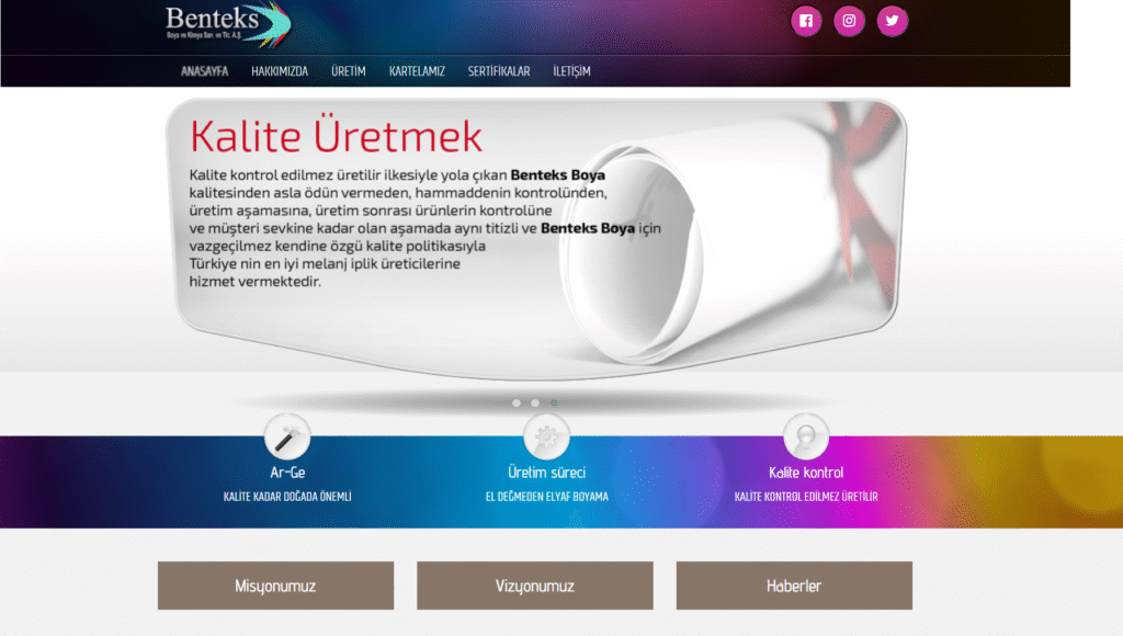 2001 yılından bu yana elyaf boyama sektöründe kalite ve güvenin adresi olan Benteks Boya, günlük 20 ton kapasitesi ve dünya standartlarının üzerinde üretim anlayışıyla öne çıkıyor. Modern ve kullanıcı dostu web tasarımı, firmanın güçlü üretim altyapısını ve müşteri odaklı vizyonunu dijital ortamda en etkili şekilde yansıtıyor.