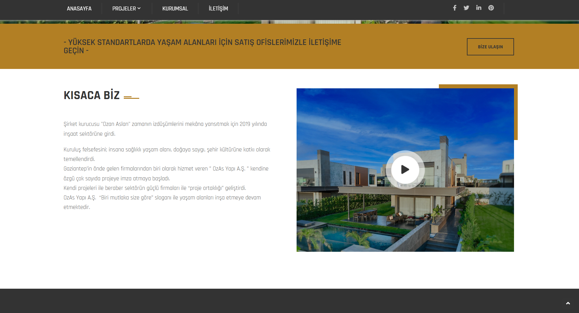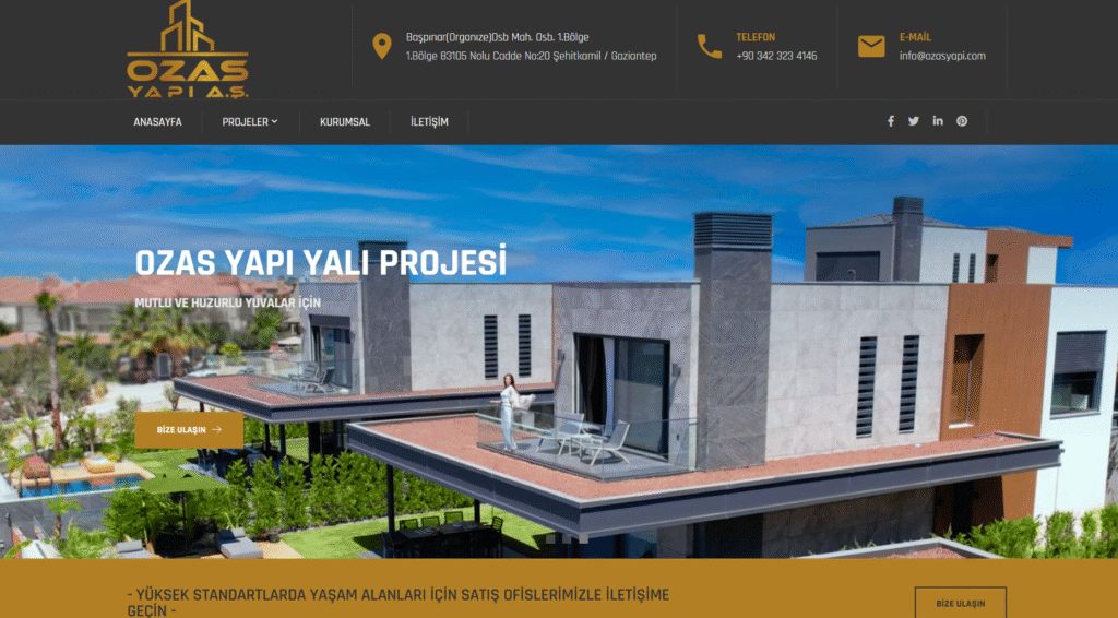 2019 yılında Ozan Aslan tarafından kurulan Ozas Yapı A.Ş., “Biri mutlaka size göre” sloganıyla insan odaklı, doğaya saygılı ve şehir kültürüne katkı sağlayan projeler üretmektedir. Gaziantep’in öncü inşaat firmalarından biri olarak hem kendi projelerini hem de güçlü ortaklıklarla hayata geçirdiği projeleri başarıyla sürdürmektedir.