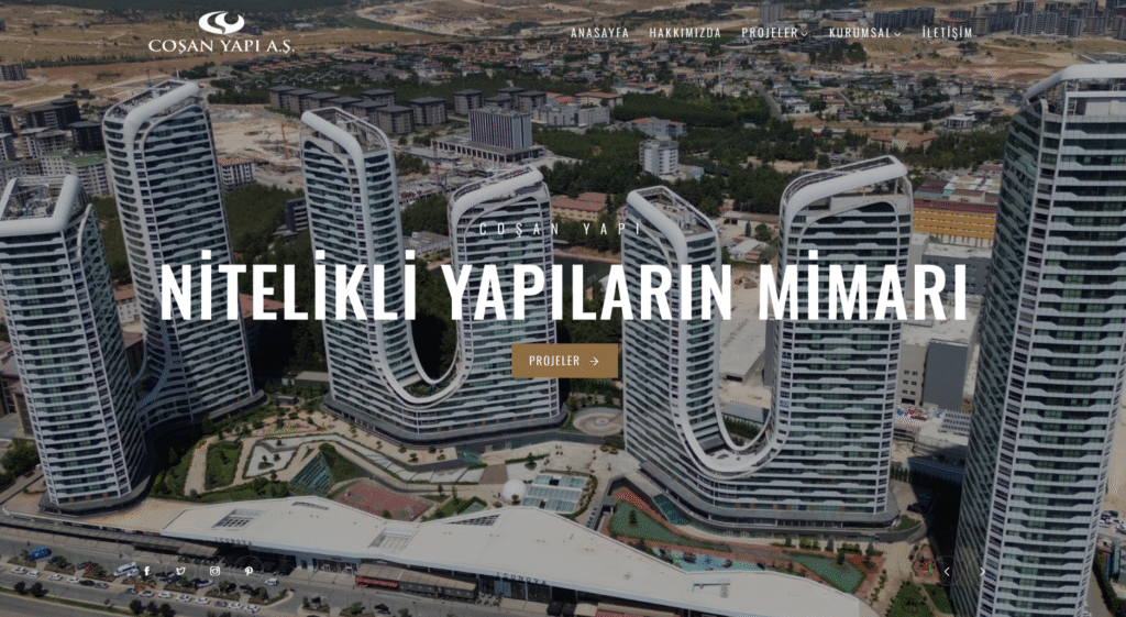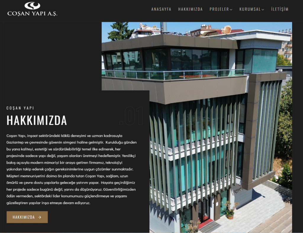 Coşan Yapı web sitesini, sektördeki köklü deneyimimizi ve uzmanlığımızı en iyi şekilde yansıtacak şekilde biz tasarladık. Modern ve kullanıcı dostu tasarımıyla ziyaretçilere güven veren, projelerimizi ve kurumsal değerlerimizi etkili biçimde anlatan bir dijital platform oluşturduk. Kalite, estetik ve sürdürülebilirlik odaklı yaklaşımımızı web sitemize yansıtarak, markanın güçlü ve profesyonel imajını destekledik.