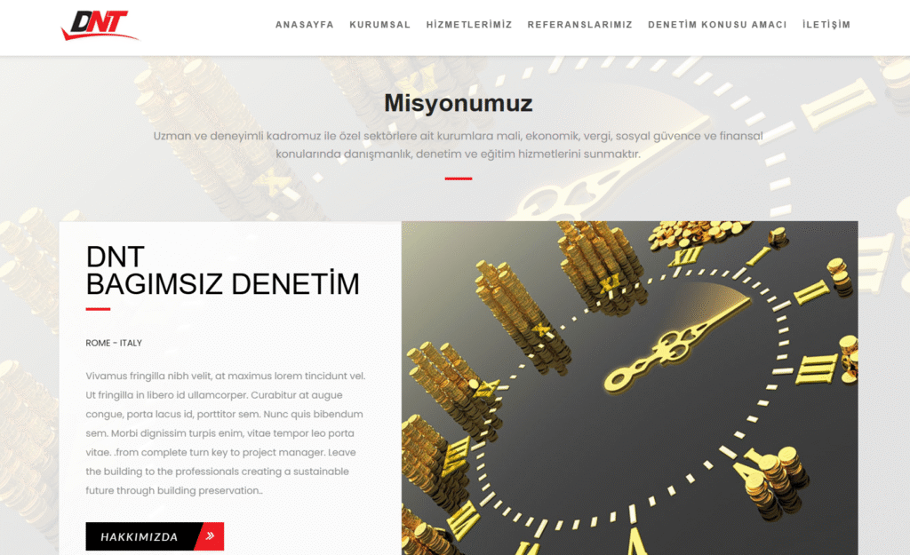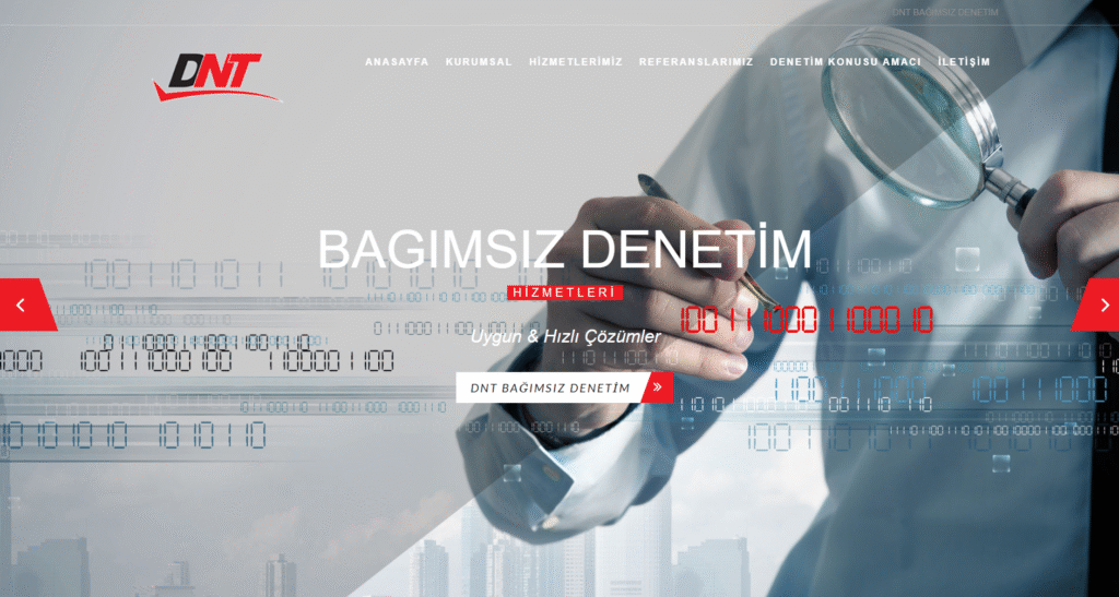 DNT Bağımsız Denetim, uzman kadrosuyla mali, ekonomik, vergi ve finansal alanlarda güvenilir çözümler sunan güçlü bir danışmanlık markası. Biz de bu güven ve profesyonelliği dijital dünyada aynı etkiyle yansıtacak modern, kurumsal ve kullanıcı dostu web sitesini tasarladık. Sade ve net bir bilgi mimarisi, güçlü görseller ve hızlı erişim yapısıyla DNT’nin prestijini çevrimiçi platformda da hak ettiği seviyeye taşıdık.