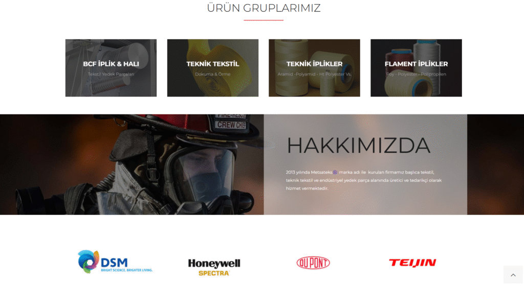 2013 yılında kurulmuş olan Metsateks®’in teknik tekstil ve endüstriyel yedek parça alanındaki başarılı faaliyetlerini yansıtan bu web sitesi, kullanıcı dostu arayüz ve modern tasarım anlayışıyla tarafımızca profesyonel şekilde hazırlanmıştır. Ziyaretçilere kolay erişim ve bilgi akışı sağlayan site, firmanın sektördeki konumunu güçlendirmeye destek olmaktadır.